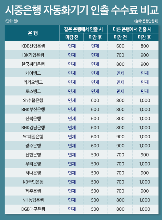 나머지 같은 은행이든, 다른 은행에서 인출 시든 모두 면제되는건 케이뱅크, 카카오뱅크, 토스뱅크가 유일합니다.