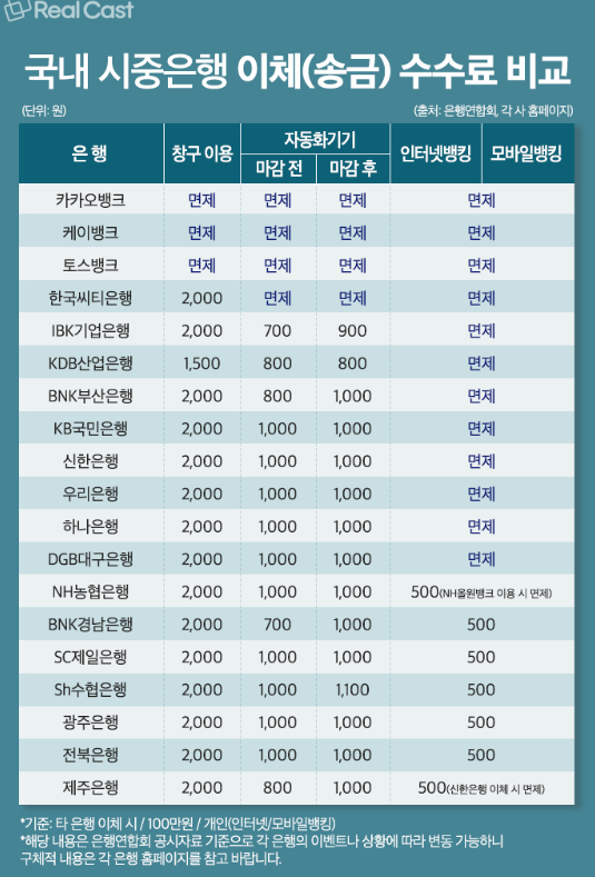 그 밖에도 국내 시중은행 이체 송금 수수료를 비교해보면, 실제 카카오뱅크, 케이뱅크, 토스뱅크 등이 있는데,