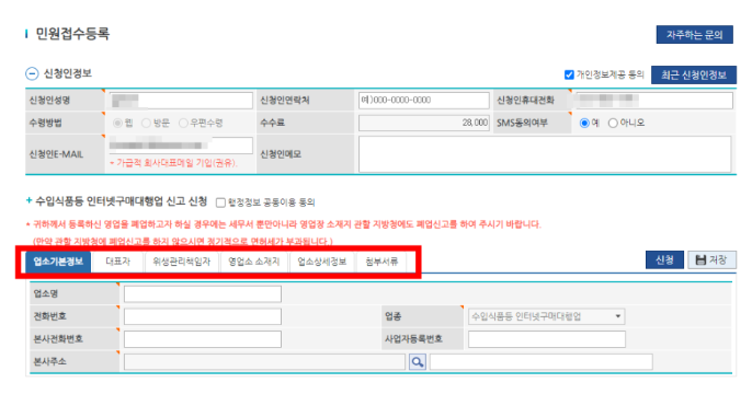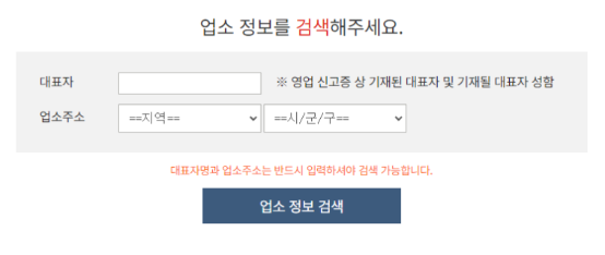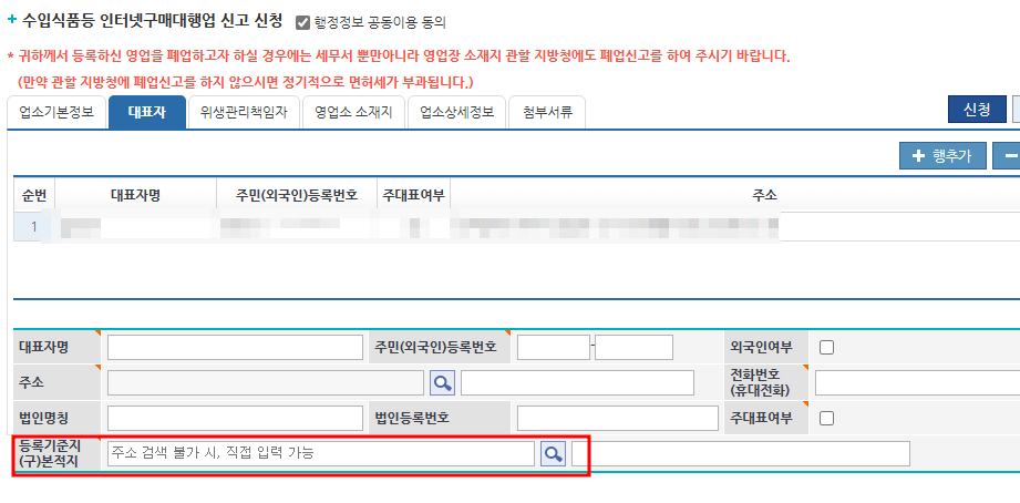 대표자 성명을 넣고, 업소주소는 대전광역시, 대구광역시 등으로 넣습니다.