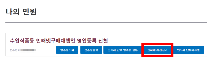 식품안전나라 > 통합민원상담 > 나의 민원 클릭하면, 면허세 자진신고 부분이 나옵니다.