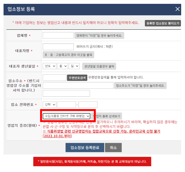 업소 등록을 눌러서 영업의 종류에 [수입식품등 인터넷 구매 대행업]을 넣습니다.