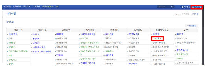 오른쪽 상단 사이트맵에서 > 통관단일창구 > 신청서 작성 클릭